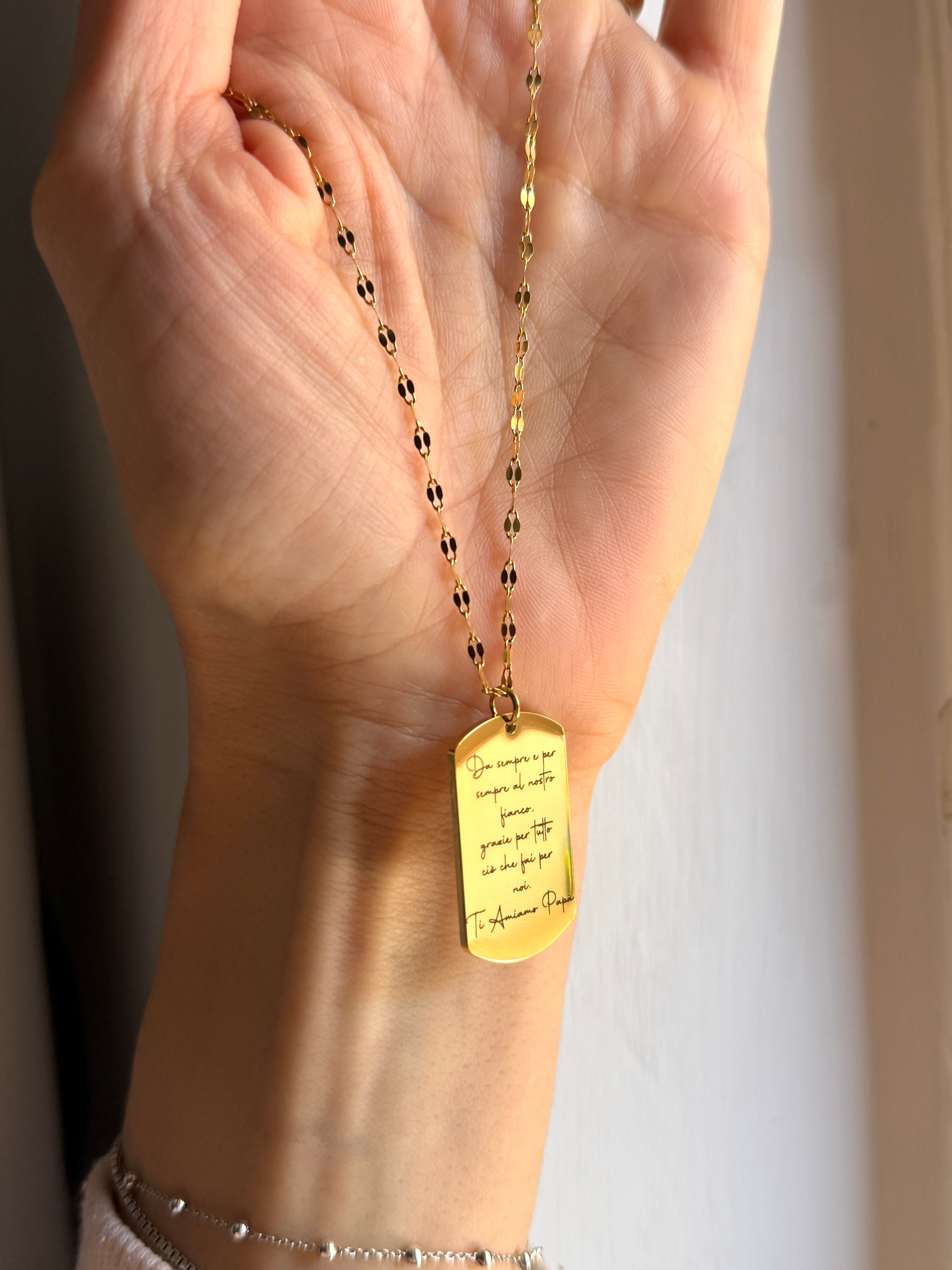Collana con Placchetta realizzata in Acciaio Inossidabile con Catena Regolabile, può essere incisa su tutti e 4 i Lati. Disponibile nelle Finiture: Oro Bianco e Oro Giallo.