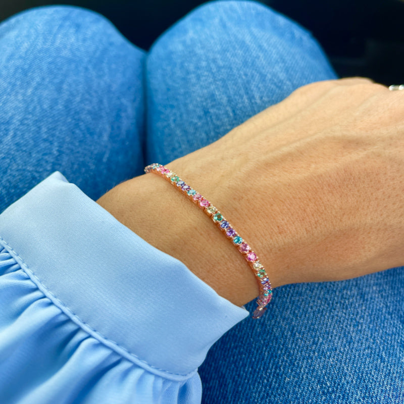Bracciale Tennis realizzato per metà di zirconi a gradazioni di colori pastello, e metà catena squadrata. Realizzato in Argento925, NikeelFree, Regolabile.