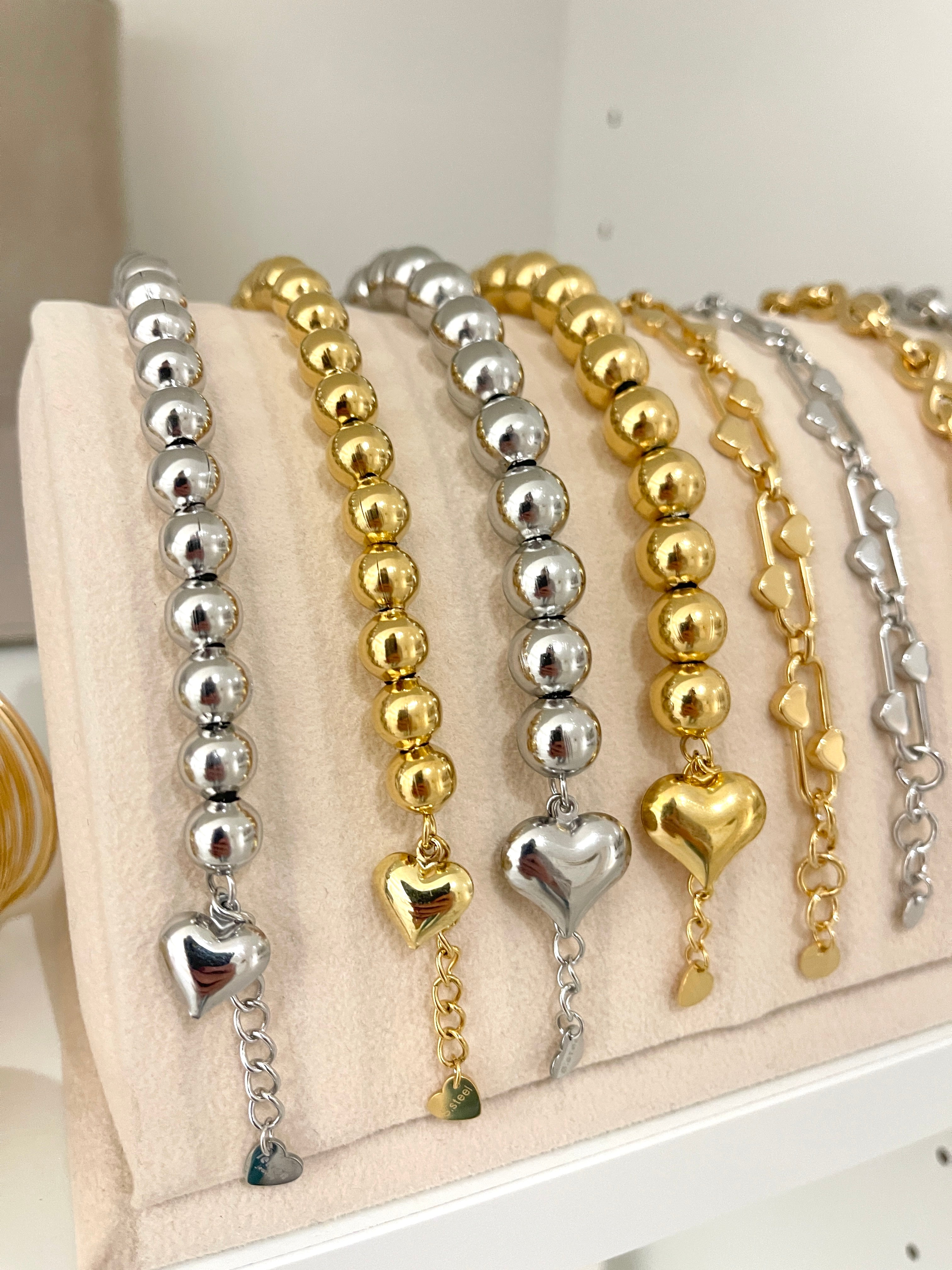 Bracciale con Sfere e Charms Cuore Sonaglio Disponibile nelle Finiture: Silver o Gold - Bi-Color. Tempi di Spedizione: 24/48h salvo Disponibilità di Magazzino altrimenti 10 gg. lavorativi.