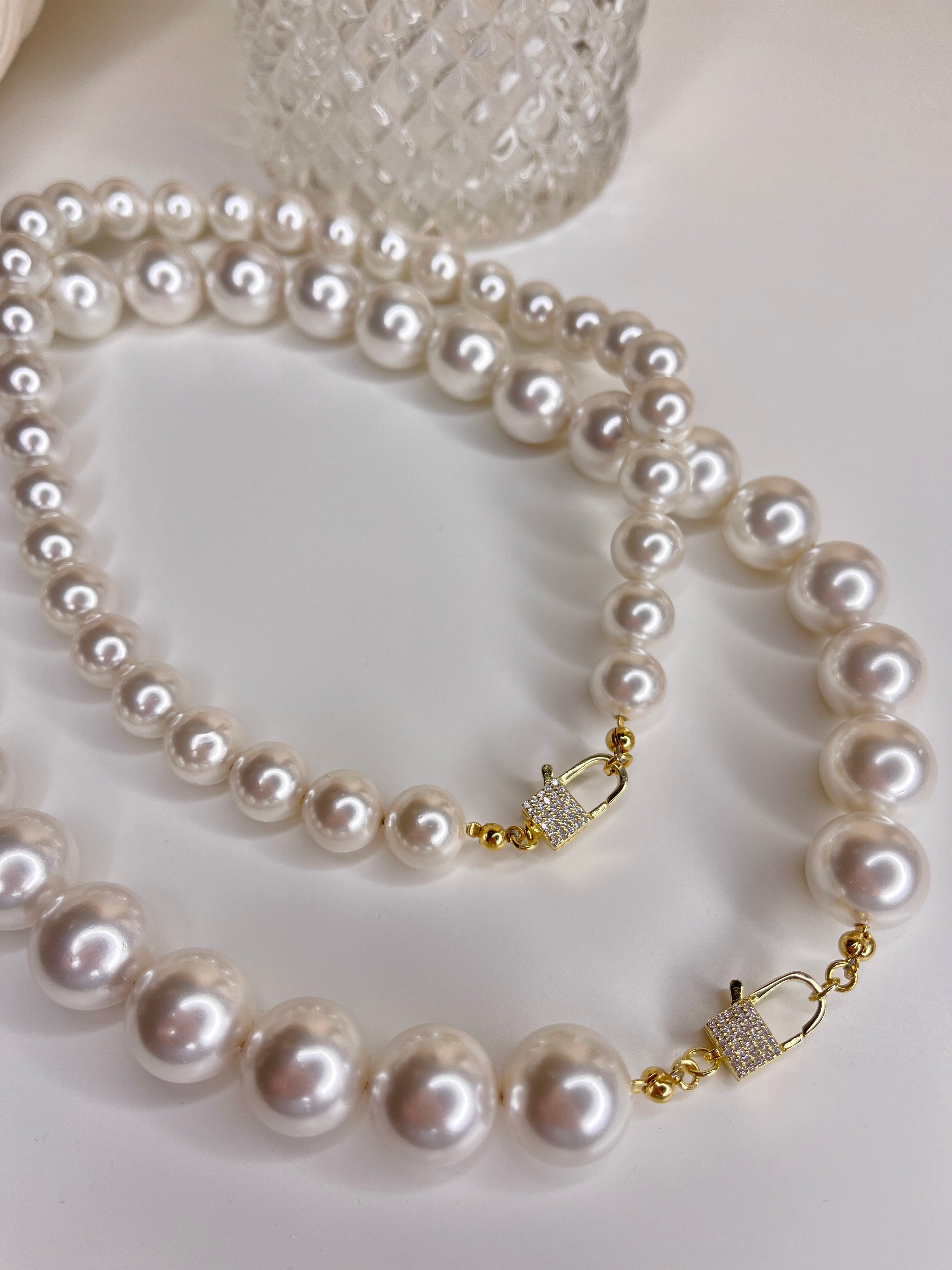 Collier con Perle e Moschettone Pavè Apribile, realizzata in Argento925, Perle di Maiorca e Moschettone Pavè con Gancio Apribile grazie al quale è possibile agganciare qualsiasi tipo di Charms. Dimensione Perle: 10 mm. Circa - 20 mm. Circa. Disponibile nelle Finiture: Oro Bianco - Oro Giallo - Oro Rosa. Tempi di...