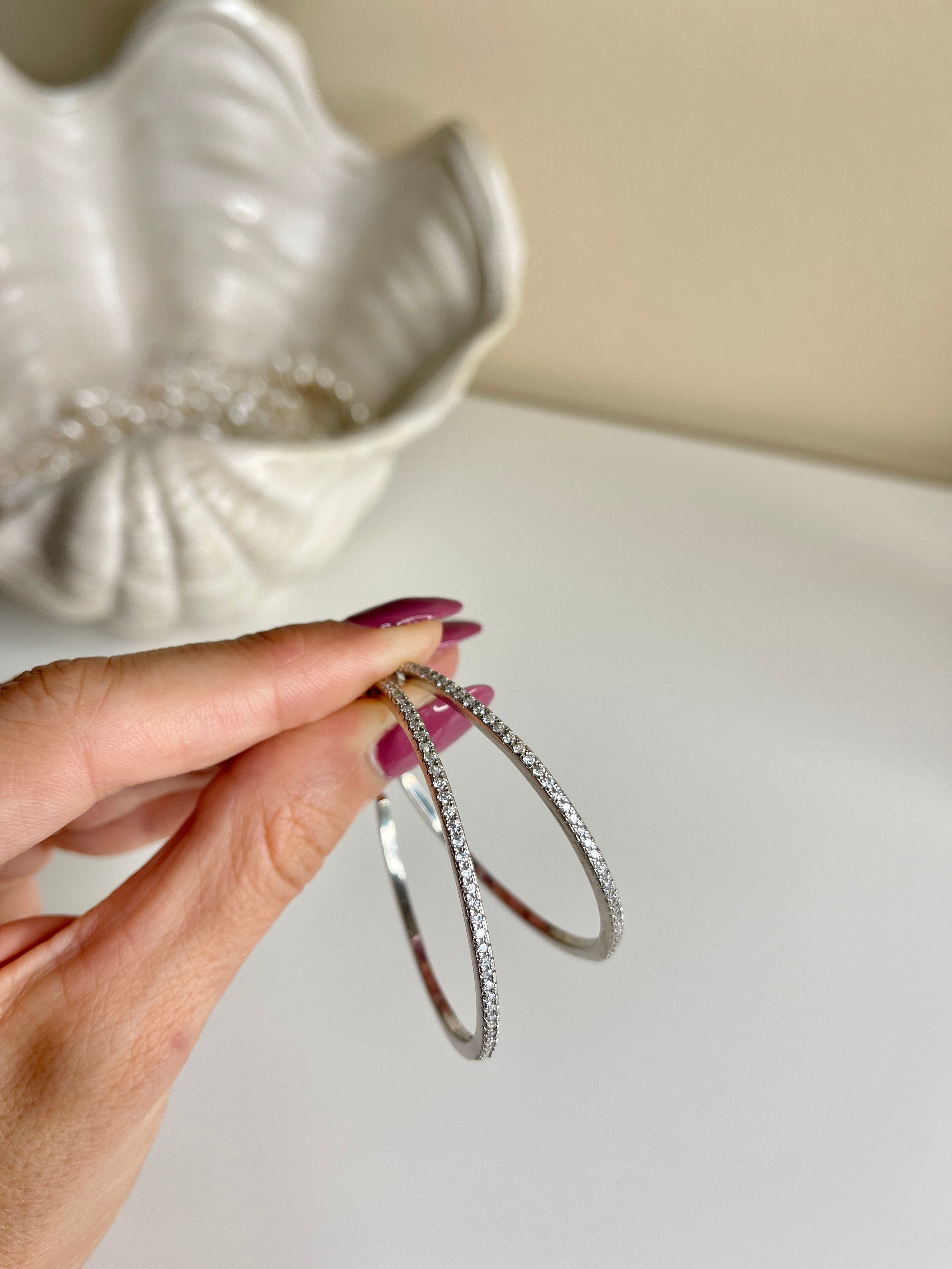 Orecchini Cerchio realizzati in Argento925, NikeelFree con Pietre Cubic Zirconia da 3 mm. Chiusura a Farfallina. Disponibili esclusivamente nella Finitura: Oro Bianco. Tempi di Lavorazione e Produzione 24/48h Salvo Disponibilità - 10/16 gg. Lavorativi.