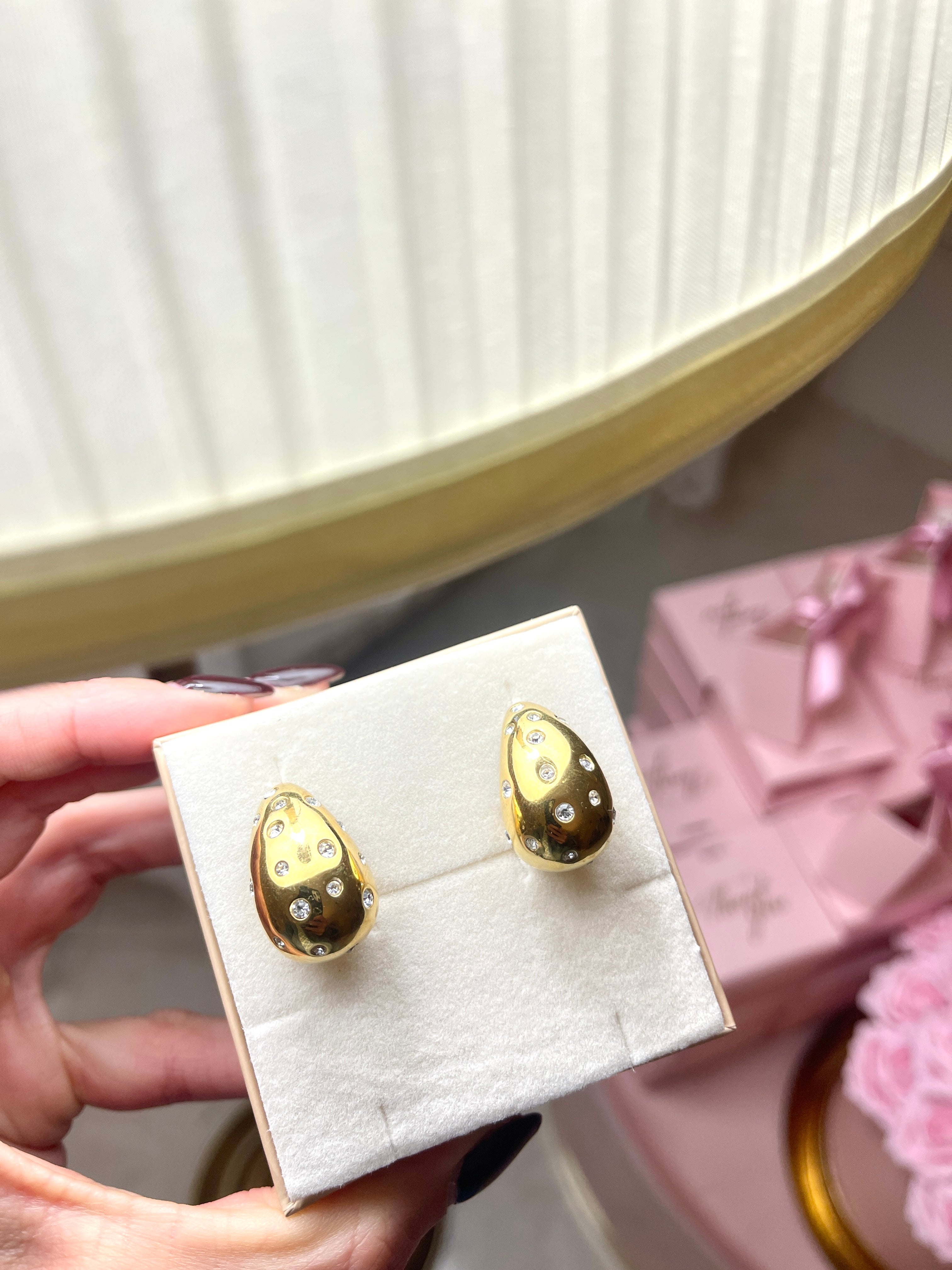 Orecchini a Goccia con Zirconi, chiusura a farfallina, realizzati in Acciaio Inossidabile Disponibile nella Finitura: Gold. Tempi di Spedizione: 24/48h salvo Disponibilità di Magazzino altrimenti 10 gg. lavorativi. Il Prezzo Intende la Coppia.